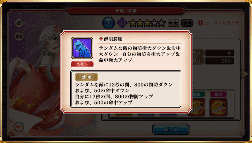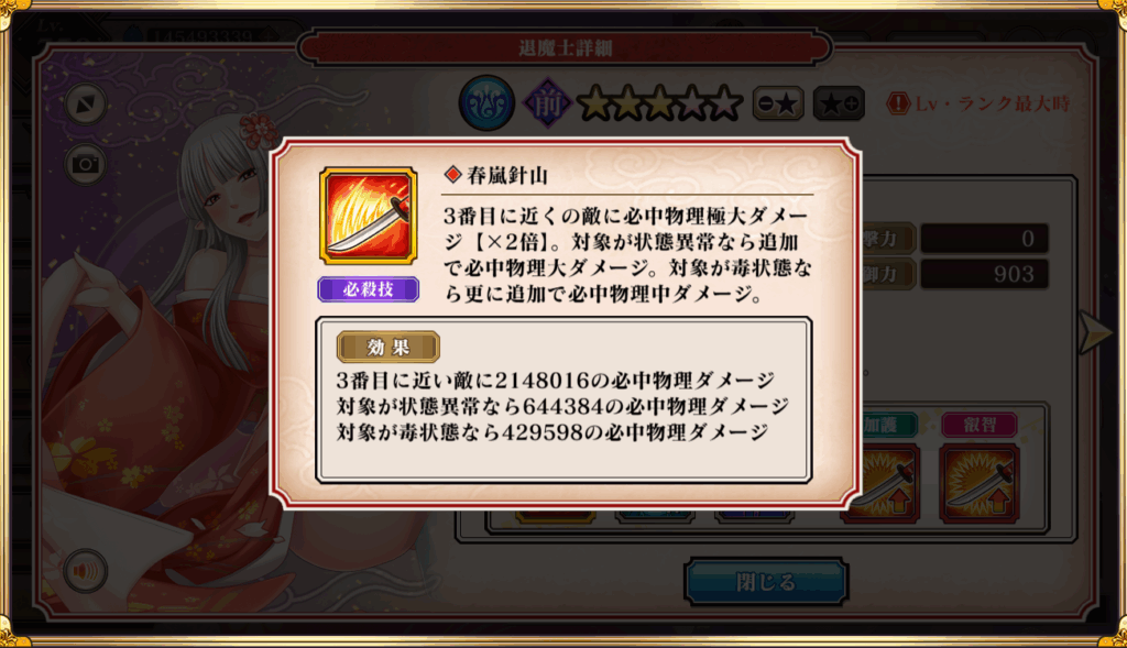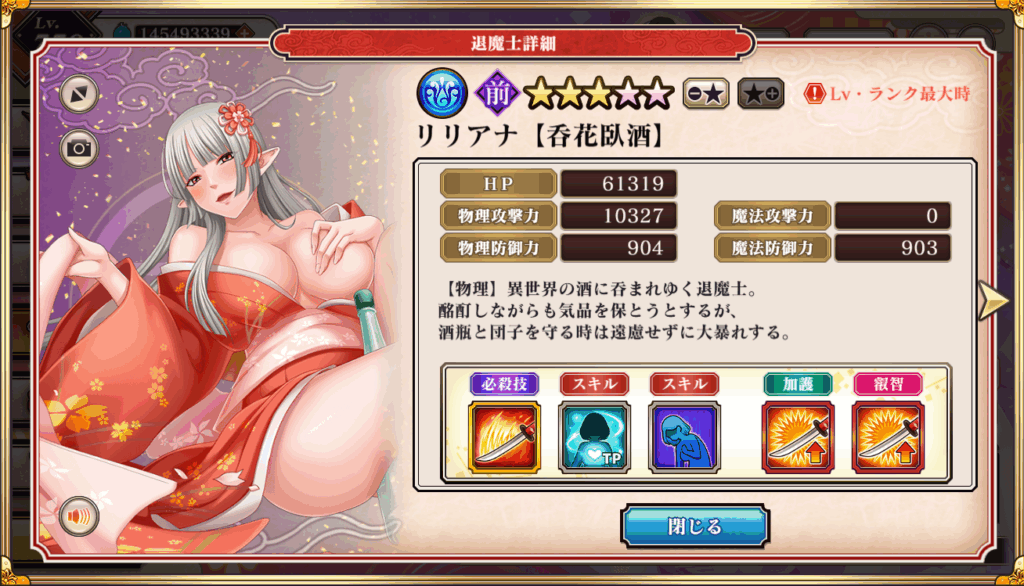 ・必殺技ダメージは最大3221998で必中効果あり。必中は「暗闇」や百鬼妖乱の禁太郎が使う「霧隠れ」、卑境攻略戦の「地形効果」などで活躍する。(※リリアナは単体必殺技なので百鬼妖乱では微妙かも)